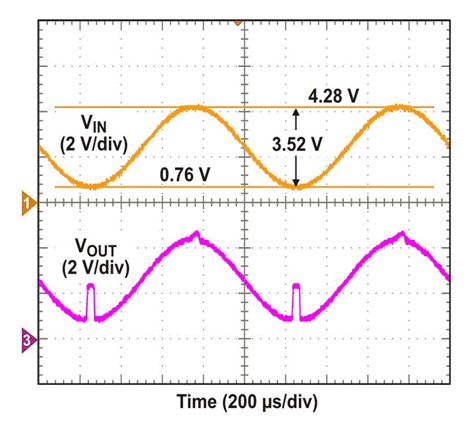 VIN稍稍增加至3.52 Vp-p,VOUT便開始在正(5V)和負(0V)軌附近呈現非線性行為(圖5)。 VIN進一步增加至4.2 Vp-p,明顯超出VICMR。由于輸入峰值在正軌附近超出限制,因此其上跳至正軌(5V),并在VIN返回到某個可接受范圍以前一直保持在該狀態,最終VOUT信號出軌(圖6)。隨著輸入降至負軌附近限制以下,VOUT信號表現出倒相,同時其跳至中軌(2.5V),并在VIN增加到VICMR范圍內某個可接受電壓水平以前,一直通過偏壓來跟隨VIN。