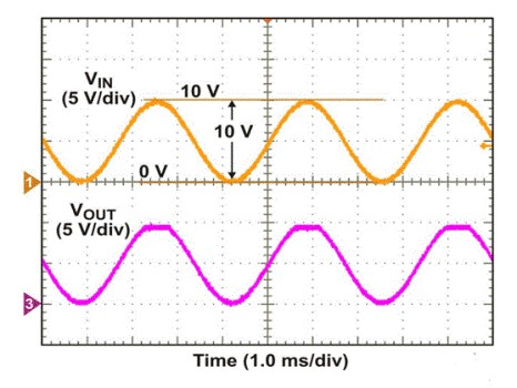 為了測試該電路,我們將 VCC/2= 5V DC偏移的300 Hz正弦波應用于輸入端。在VOUT出現變化以前, 一直對AC幅值進行調節。如圖4所示,當應用10 Vp-p輸入時,VOUT在 正軌附近出現一個經削波的信號,而非負軌附近。如果輸入超出VCC – 0.8V(本例中為9.2V),這種正軌附近出現的非理想行為是我們能夠預計到的。9.2V以下VIN電平和低至0V時,VOUT顯示出正確的波形,正如我們所預期的那樣。