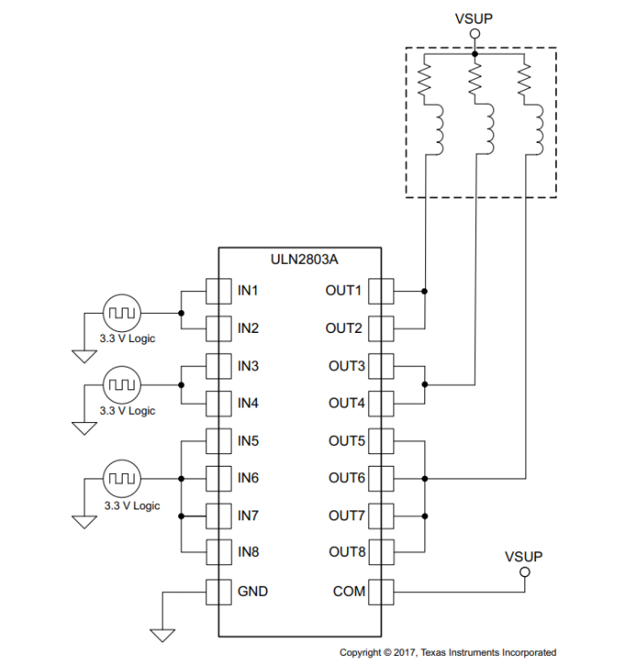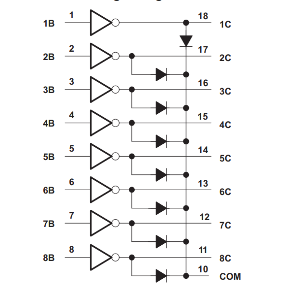 應(yīng)用包括繼電器驅(qū)動器、錘子驅(qū)動器、燈驅(qū)動器、顯示驅(qū)動器(LED和氣體放電)、線路驅(qū)動器和邏輯緩沖器。這個ULN2803ADWR器件的每個達(dá)林頓對都有一個2.7-kΩ的串聯(lián)基極電阻器,用于直接與TTL或5V CMOS器件一起操作。