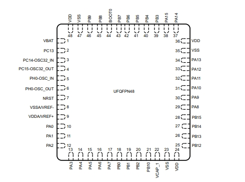 STM32F413CGU6提供一個(gè)12位ADC、兩個(gè)12位DAC、一個(gè)低功耗RTC、12個(gè)通用16位定時(shí)器,包括兩個(gè)用于電機(jī)控制的PWM定時(shí)器、兩個(gè)通用32位定時(shí)器和一個(gè)低功率定時(shí)器。